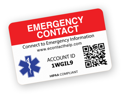 Our "Patent Pending" Emergency Contact Card helps facilitate vital communications in case of an accident or emergency. The account owner receives two cards with a unique ID number, granting access to their designated Emergency Contact. Without the E-Card, connecting with family and friends may take many hours and sometimes even days. It is a vital link for information and family contact that helps to relieve stress and anxiety.
